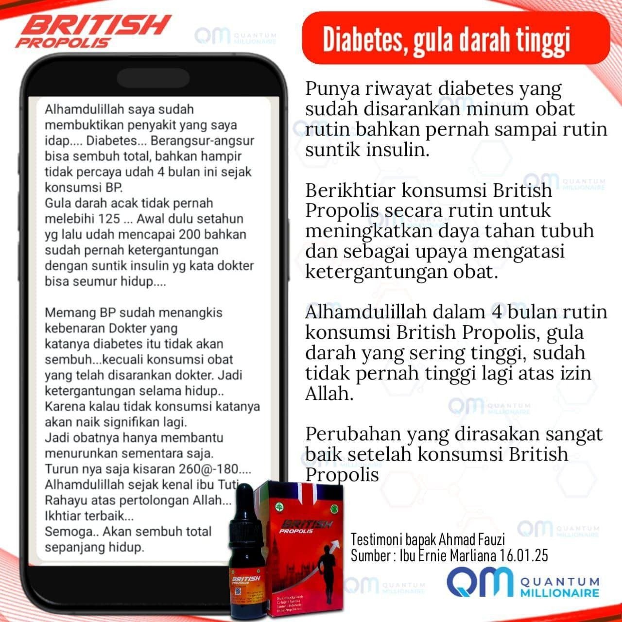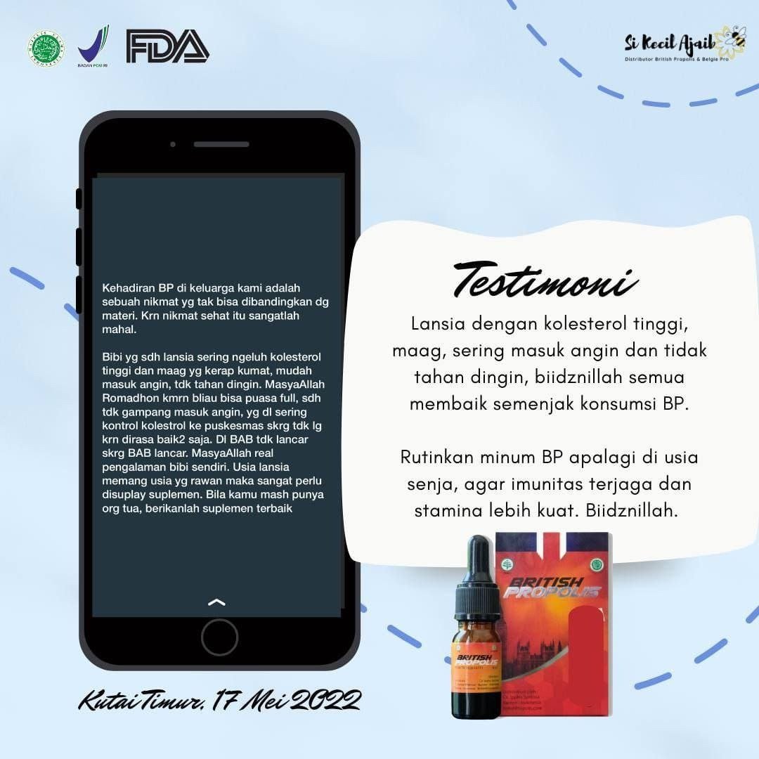 British Propolis Reguler merupakan propolis pilihan dengan kandungan flavonoid tinggi hingga 4x lebih kaya dibandingkan propolis biasa. Formulanya membantu menjaga stamina, memperkuat sistem imun, serta mendukung tubuh dalam menghadapi berbagai keluhan kesehatan seperti diabetes, asam urat, kolesterol, hingga membantu meredakan ketidaknyamanan saat PMS.